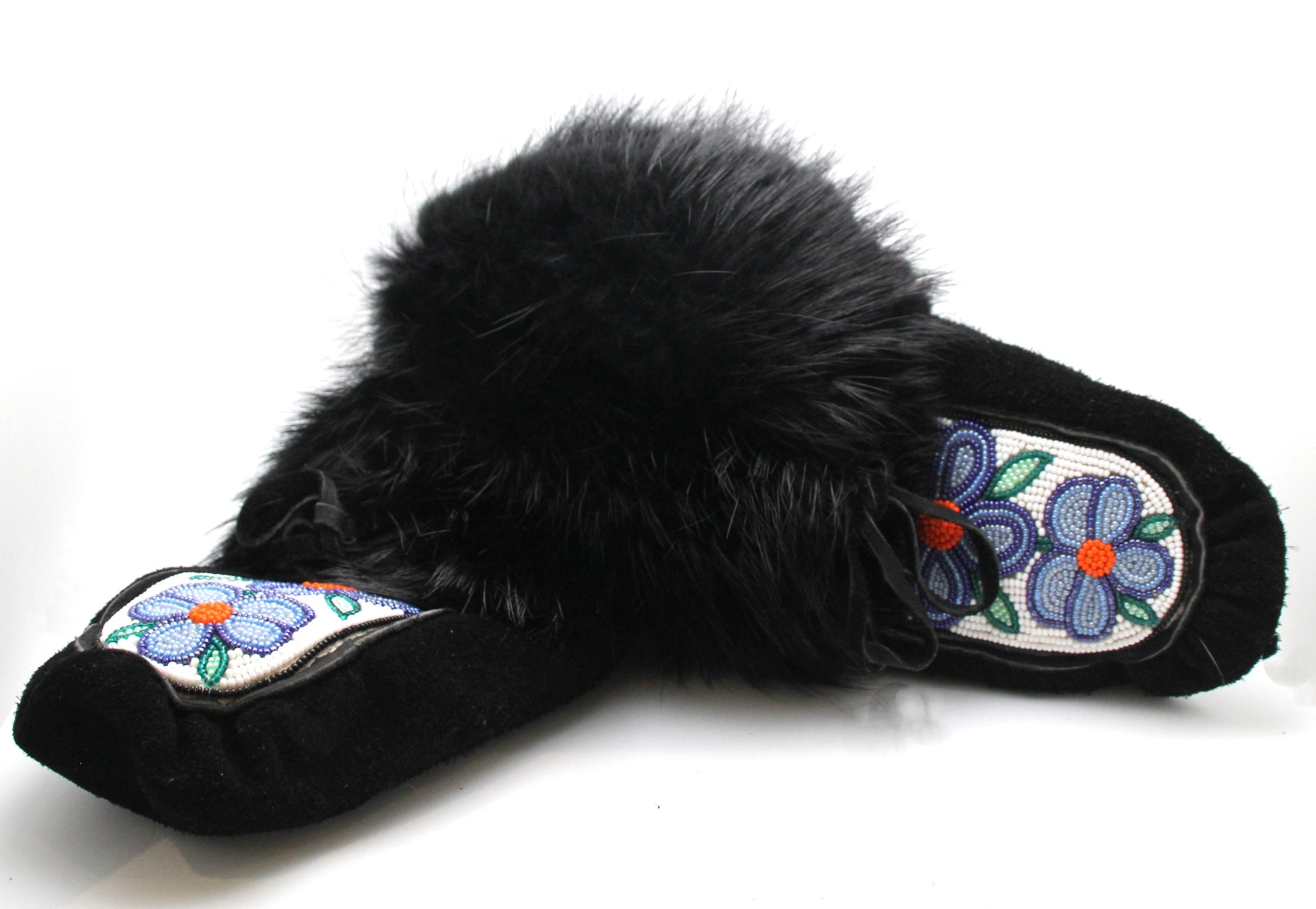 Hand beaded on black suede with black fox trim.